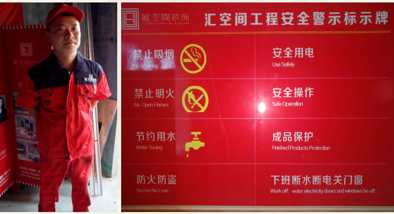 工地現場需配備統一的操作臺,操作臺必須刷正紅色油漆,下測立板區域居中噴涂“匯空間裝飾”字樣。
